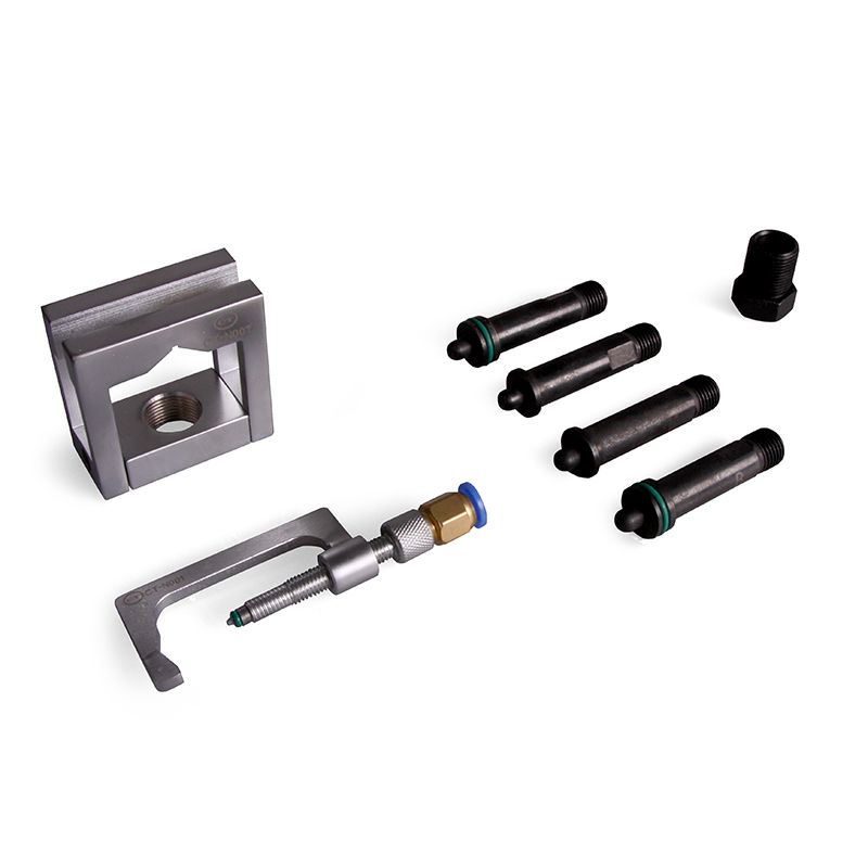 Адаптер для форсунок Bosch&Denso Common Rail - Назначение универсального адаптера: подключение любых форсунок Common Rail к испытательному стенду. Площадка для подвода имеет регулировку, которая используется для форсунок с боковым подводом под разными углами. - Применение приспособления для обслуживания дизелей: дизельные форсунки Common Rail с боковой подачей и обраткой топлива Bosch / Denso. Комплектация набора для форсунок Common Rail - Корпус с регулируемой площадкой для линии подачи – 1 шт. - Штуцер для подвода линии подачи M14X1.5 с жестким уплотнением – 2 шт. - Штуцер для подвода линии подачи M14X1.5 с резиновым уплотнением – 2 шт. - Адаптер с цанговым зажимом ?8 мм для подключения линии обратной подачи – 1 шт. - Уплотнительные кольца для обратки – 2 шт.