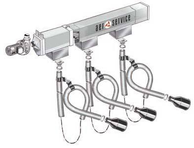 Рельсовая система длиной 20 м с 3-мя каретками, с 3-мя шлангами термостойкости до +200 С и диаметром 100 мм, с вентилятором и 3-мя резиновыми газоприемными насадками