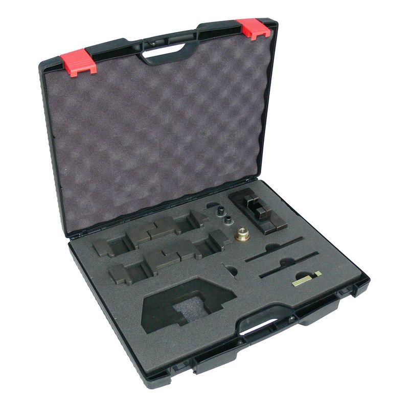 Приспособления для ремонта БМВ Все приспособление входящие в данный набор, как правило, используют на старых автомобилях БМВ (без системы VANOS). В дальнейшем набор инструмента можно доукомплектовать другими приспособлениями, например регулировочный шаблон BMW 116150 для моторов M52TU, M54, M56 или кронштейнами BMW 116450 для фиксации колес датчиков M62 с системой VANOS. Комплектация базового набора инструмента для BMW: - Шаблон для распредвала BMW 113190 (двигатель M40/M70) - Комплект для фиксации распредвала bmw 113240 (двигателя M42, M44, M50, M52, M52TU, M54, M56, MS50US, S52US) - Фиксаторы распределительных валов для M60/M62 (bmw 112440) - Фиксатор коленвала для bmw 112300 - Натяжитель цепи - Удобный пластиковый кейс Инструкция по применению инструментов для BMW В этом материале изложены пояснения по применению приспособлений для BMW, тем не менее настоятельно рекомендуем пользоваться технической документацией к автомобилю. CT-E1021 [ /catalogue/?catalogue_id=bmw-kit-1 ] – зажимная стойка для M62 - CT-A1245 [ /catalogue/?catalogue_id=bmw-115180 ] – фиксатор коленвала - CT-D1021 [ /catalogue/?catalogue_id=bmw-116420 ] – торцевой ключ для магнитного клапана - CT-G1021 [ /catalogue/?catalogue_id=1021 ] – зажимная стойка для M62 - CT-A1137 [ /catalogue/?catalogue_id=vanos-key ] – спец ключ для VANOS - CT-2045 [ /catalogue/?catalogue_id=bmw-tool-m62 ] – регулировочные шаблоны для маркерных дисков VANOS M62