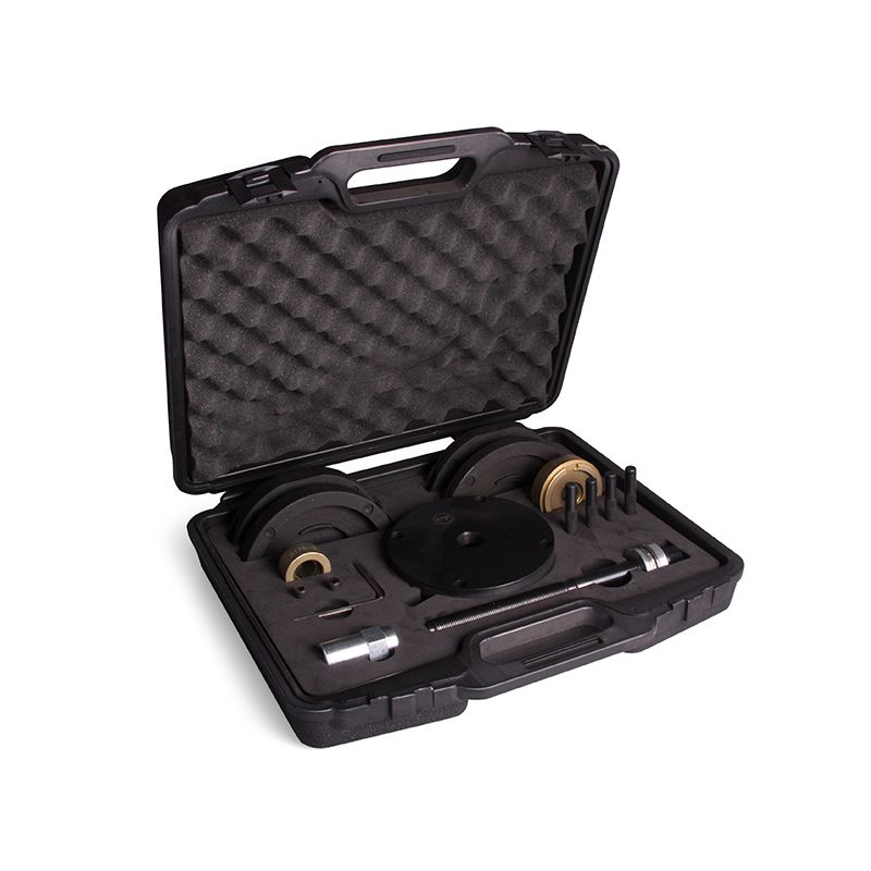 Набор приспособлений предназначен для замены ступичных подшипников автомобилей Volvo. Данный съемник Вольво представляет собой механический инструмент, который включает в себя стяжной шпиндель, опорную часть и составные части для захвата ступицы подшипника. Съемник предназначен для замены подшипников с Ø 78 мм.