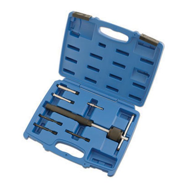 Набор специальных инструментов предназначен для демонтажа повреждённых свечей накаливания дизельных двигателей различных автомобилей. В набор входит два конусных держателя пяти типоразмеров и инерционный съемник свечей накаливания. Все инструменты упакованы в удобный пластиковый кейс для хранения и транспортировки.