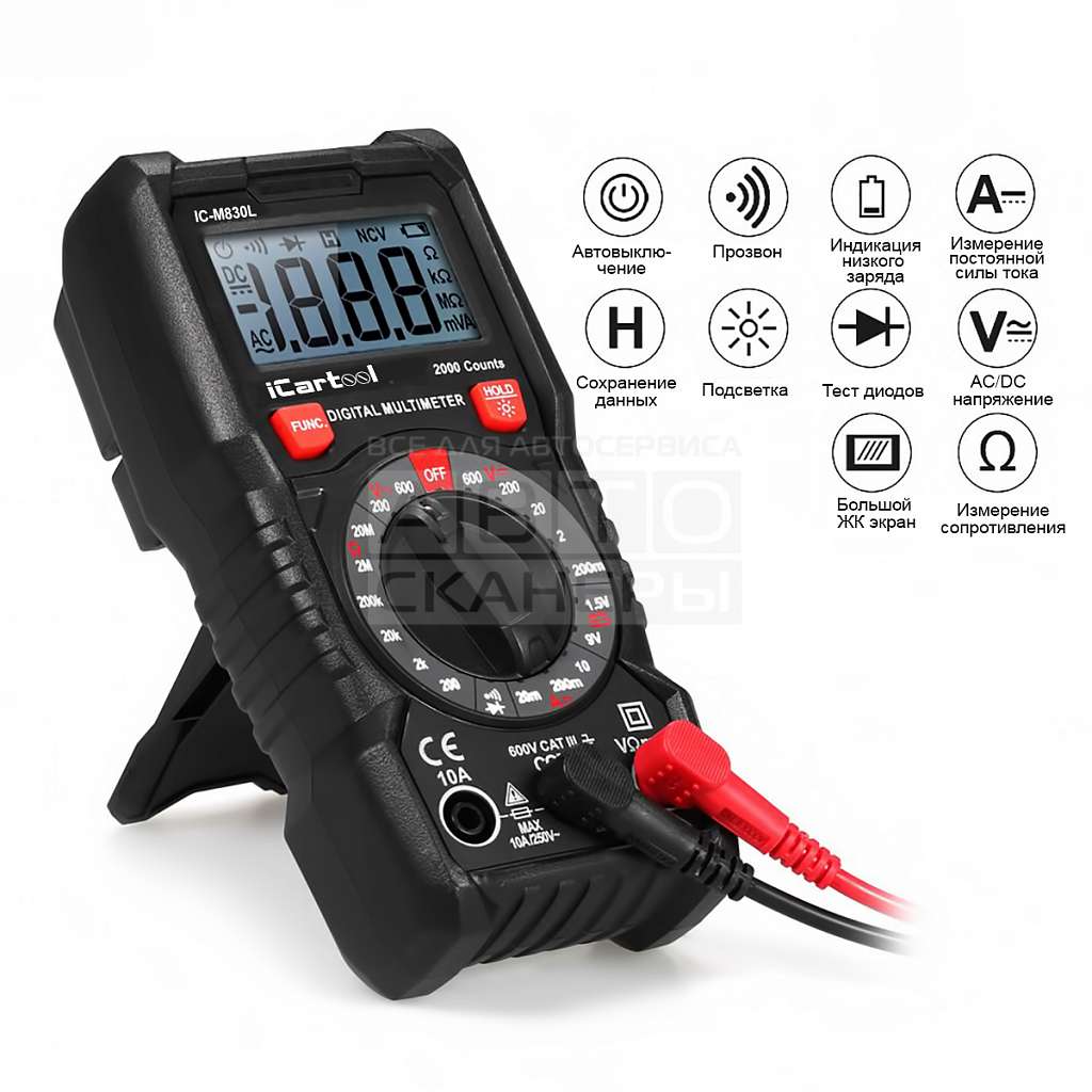 IC-M830L — многофункциональный мультиметр с классическим набором функций. Станет незаменимым помощником на производстве или дома. С помощью тестера вы сможете измерить напряжение постоянного или переменного тока, провести тест диодов, замерить сопротивление и выполнить "прозвонку" цепи.