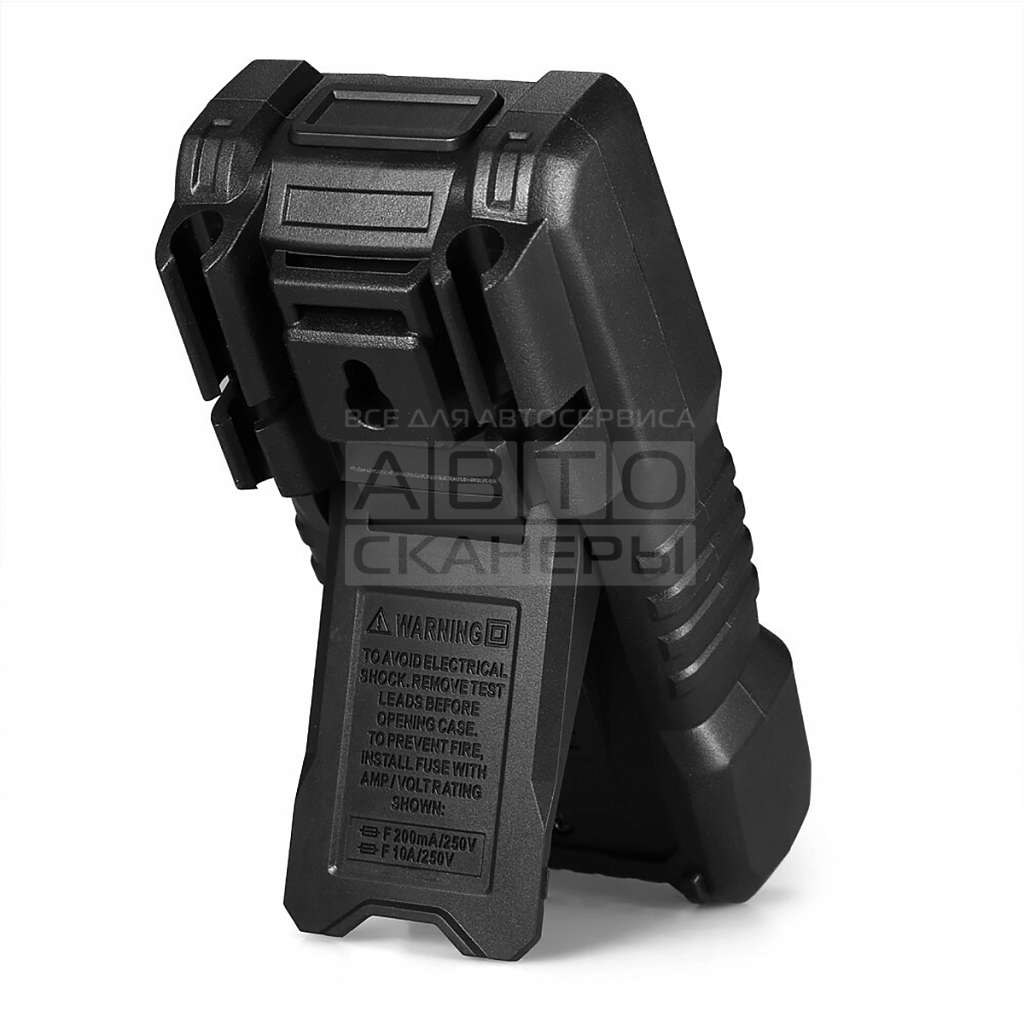 - Практичный дизайн: на задней стенке мультиметра предусмотрены крепления для тестовых щупов, а также подставка, позволяющая удобно разместить мультиметр на поверхности.