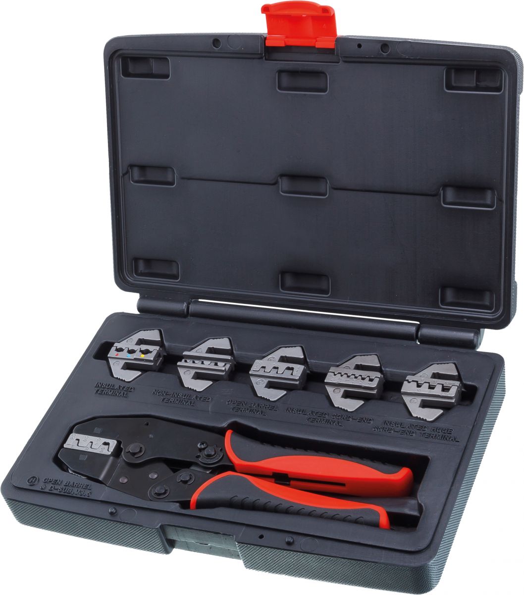 Кримпер храповичный с быстросменными губками: 1 шт. A. Губки для изолированных клемм: 1 шт. Размер сечения провода по стандартам AWG 22.18/16-14/12-10 или DIN 0.5-1.0/1.5-2.5/4-6 мм2 B. Губки для не изолированных клемм: 1 шт. Размер сечения провода по стандартам AWG 20-18/16-14/12-10/8 ; DIN 1.5/2.5/6/10 мм2; JIS 1.25/2/5.5/8 мм2 C. Губки для клемм с открытым корпусом: 1 шт. Размер сечения провода по стандартам AWG 20-18/16-14/12-10 и DIN 0.5-1.0/1.5-2.5/4-6 мм2 D. Губки для клемм cord-end малого размера : 1 шт. Размер сечения провода по стандартам AWG 22/20/18/16/14/12 и DIN 0.5/0.75/1.0/1.5/2.5/4.0 мм2 F. Губки для клемм cord-end большого размера: 1шт. Размер сечения провода по стандартам AWG 10/8/6 и DIN 6.0/10.0/16.0 мм2 H. Губки для клемм RG (коаксильного кабеля): 1шт. Размер сечения провода по стандартам AWG 14-22/8-6 и JIS 2.5/0.5/8-10 мм2