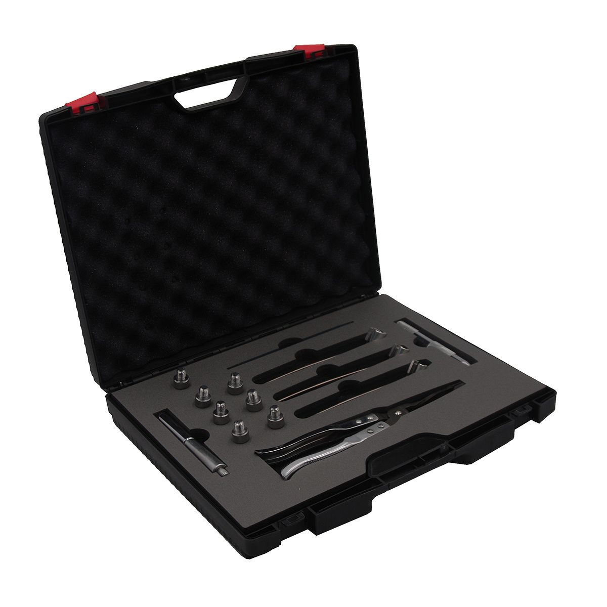 CT-Z1601 Набор для монтажа и демонтажа маслосъёмных колпачков Основные преимущества набора CT-Z1601: - Универсальные внутренние размеры вилок и диаметры направляющих штоков - Щипцы с удобным профилем рукоятки обеспечивают надёжный захват и быструю замену маслосъёмных колпачков. Комплектация: - Щипцы для замены маслосъемных колпачков - Семь направляющих переходников для колпачка диаметрами 5, 5.5, 6, 6.6 , 7, 8 - Магнитные щипцы для удержания сухарей - Две удлиняющие муфты для установки колпачков - Магнитный стержень - Направляющая ручка