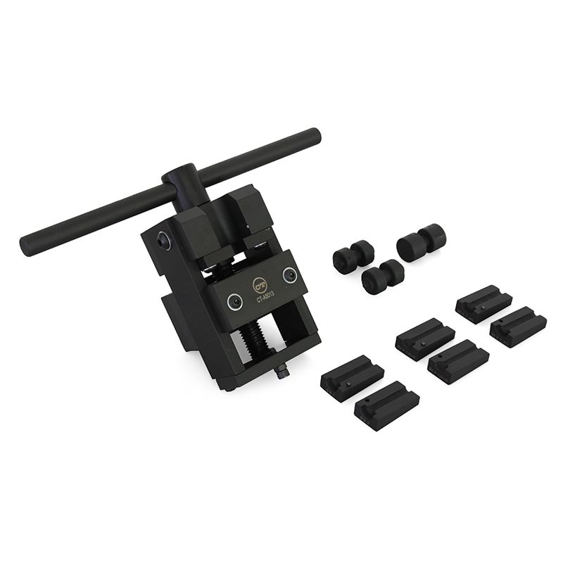 CT-A5013 Набор для развальцовки труб без применения дополнительных приспособлений Универсальная применяемость набора инструментов CT-A5013 охватывает большинство автомобилей Citroen и Rolls-Royce. В комплект набора приспособлений CT-A5013 для развальцовки труб входят уникальные закаленные клиновидные зажимы. Комплект инструментов CT-A5013 сертифицирован по международным стандартам качества SAE и DIN . Присоединительные размеры приспособлений набора от 4.75 мм ( 3/16" ) до 12 мм ( 1/2" ) в том числе 3,5 мм, 4,5 мм и 6,35 мм