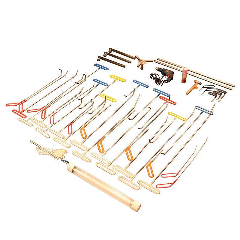 Набор для выпрямления вмятин без покраски Использование набора инструментов для выпрямления вмятин без покраски, в сочетании с навыком работы в этой области может гарантировать низкую стоимость кузовного ремонта (привлечении новых клиентов за счет стоимости кузовного ремонта), сокращение времени на кузовной ремонт, сохранение заводского покрытия. Комплектация набора для выпрямления вмятин - Набор крючков различной конфигурации, длины и диаметра – 39 шт. - Молоток с резиновой вставкой – 1 шт. - Ручная дрель Bosch – 1 шт. - Сверла – 2 шт. - Набор маркеров – 1 комп. - Деревянная оправка – 1 шт. - Лента – 1 шт. - Светильник – 1 шт. - Кольцо с крюком – 1 шт. - Кейс для хранения