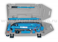 Набор аксессуаров для кузовного ремонта, включая гидроцилиндр и ручной насос.