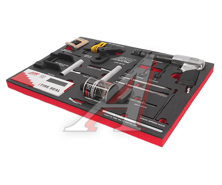 В комплекте: Съемник шаровых опор: 19, 23 мм. Молоток пневматический. Зубило для молотка: 6 шт. Соединительная муфта для пневмомолотка. Ключ монтажный для рулевых тяг. Приспособление для разведения тормозных цилиндров. Приспособление для установки вентиля. Крюк для тормозных пружин. Жгут для ремонта автошин. Шило для ремонта автошин: 2 шт. Клей для ремонта автошин. Общее количество предметов: 18 шт.