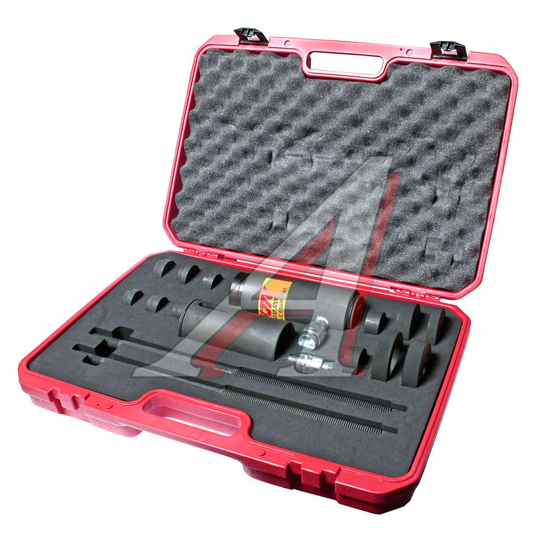 Комплектация Цилиндр - 1 шт. Оправка (внутренний/внешний диаметр: 68/75 мм) - 1 шт. Оправка (внутренний/внешний диаметр: 60/70 мм) - 1 шт. Оправка (внутренний/внешний диаметр: 35/43 мм) - 1 шт. Оправка (внутренний/внешний диаметр: 32/44 мм) - 1 шт. Оправка (внутренний/внешний диаметр: 28/35 мм) - 1 шт. Оправка (внутренний/внешний диаметр: 28/33 мм) - 1 шт. Оправка (внутренний/внешний диаметр: 48/65 мм) - 1 шт. Оправка (внутренний/внешний диаметр: 24/40 мм) - 1 шт. Оправка (внутренний/внешний диаметр: 28/33 мм) - 1 шт. Оправка (внутренний/внешний диаметр: 20/40 мм) - 1 шт. Оправка (внутренний/внешний диаметр: 25/30 мм) - 1 шт. Оправка (внутренний/внешний диаметр: 45/65 мм) - 1 шт. Резьбовая шпилька (длина/диаметр: 450/14 мм) - 1 шт. Резьбовая шпилька (длина/диаметр: 450/16 мм) - 1 шт. Гидроцилиндр - 1 шт. Обратный штуцер - 1 шт. Описание Предназначен для снятия/установки втулок и сайлентблоков при помощи гидравлического привода. Применяется с адаптером JTC-CP350. Насос поставляется отдельно (артикул: JTC-HB600). Применение Используется на грузовых автомобили европейских производителей Scania, Volvo и других грузовых автомобилях большой и средней грузоподъемности японских производителей Isuzu, Fuso, Toyota и др. Технические характеристики При мощности насоса 10000 psi (700 кг/см²), максимальное усилие, создаваемое гидравлическим приводом, составляет 15 т. Рабочее усилие: 10 тонн. Важные рекомендации Во время работ обязательно нанесение смазки на резьбовые шпильки.