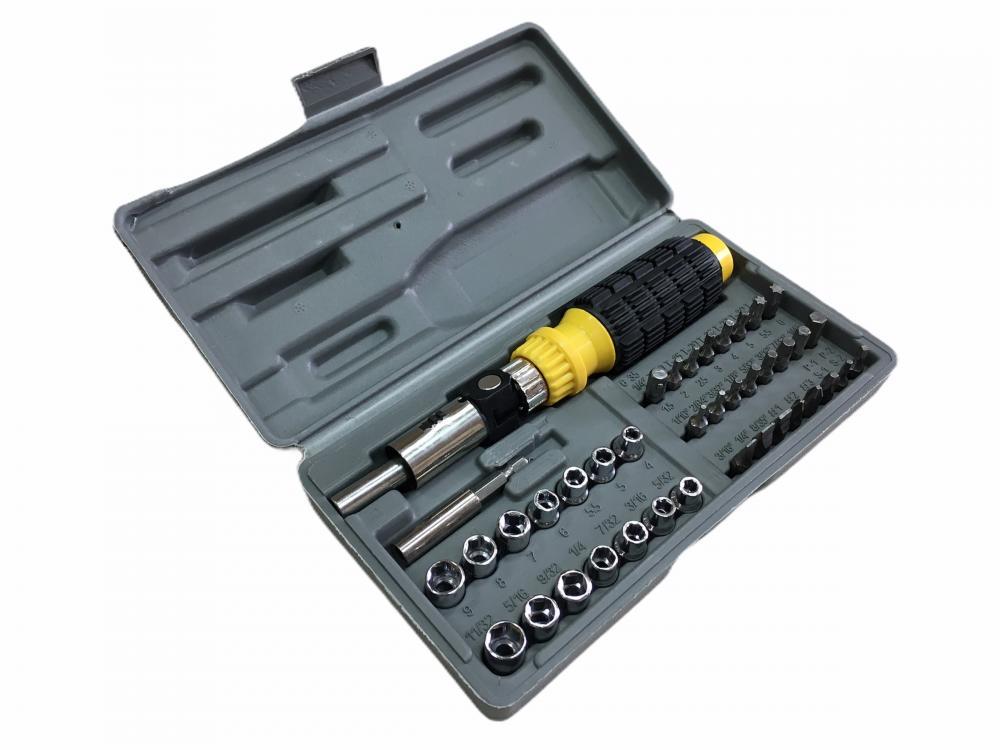 Набор инструментов для дома Zitrek SHP41В составе набора:Биты:Отвертка H: 1.5; 2.0; 2.5; 3.0; 4.0; 5.0; 5.5; 6.0; Отвертка PH: 1; 2; 3;Отвертка PZ: 1; 2;Отвертка SL: 5; 6; 7;Отвертка T: 10; 15; 20; 25; 27; 30; 40; Адаптер 25мм;Торцевые головки мм.: 4; 5; 5.5; 6; 7; 8; 9; Торцевые головки: 11/32; 5/16; 9/32; 1/4; 7/32; 3/16; 5/32