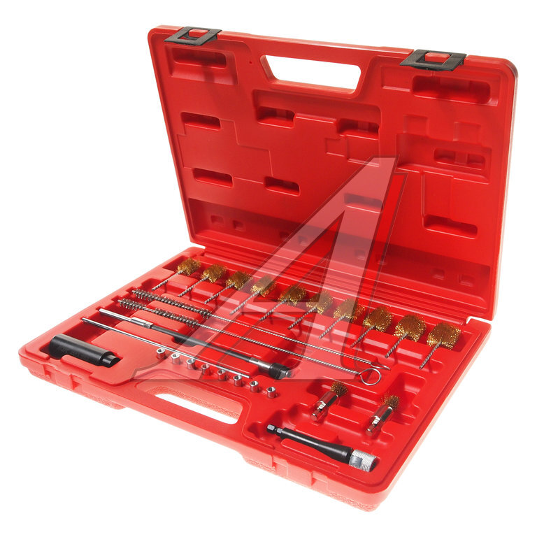 Используется для очистки посадочных мест форсунок дизельных автомобилей. В комплекте: 10 шт. - медные щетки: 18, 19, 21, 24, 26 х 2 шт. каждого размера. 1 шт. - щетка для очистки: 9 х 100 мм.; 2 шт. - щетки: 300 мм. Х 2 шт.; 1 шт. - гибкий держатель; 1 шт. - адаптер щетки с держателем; 1 шт. - опорный элемент; 2 шт. - щетки металлические для очистки посадочных мест форсунок; 8 шт. - заглушки; 1 шт. - пластиковая втулка для щетки.