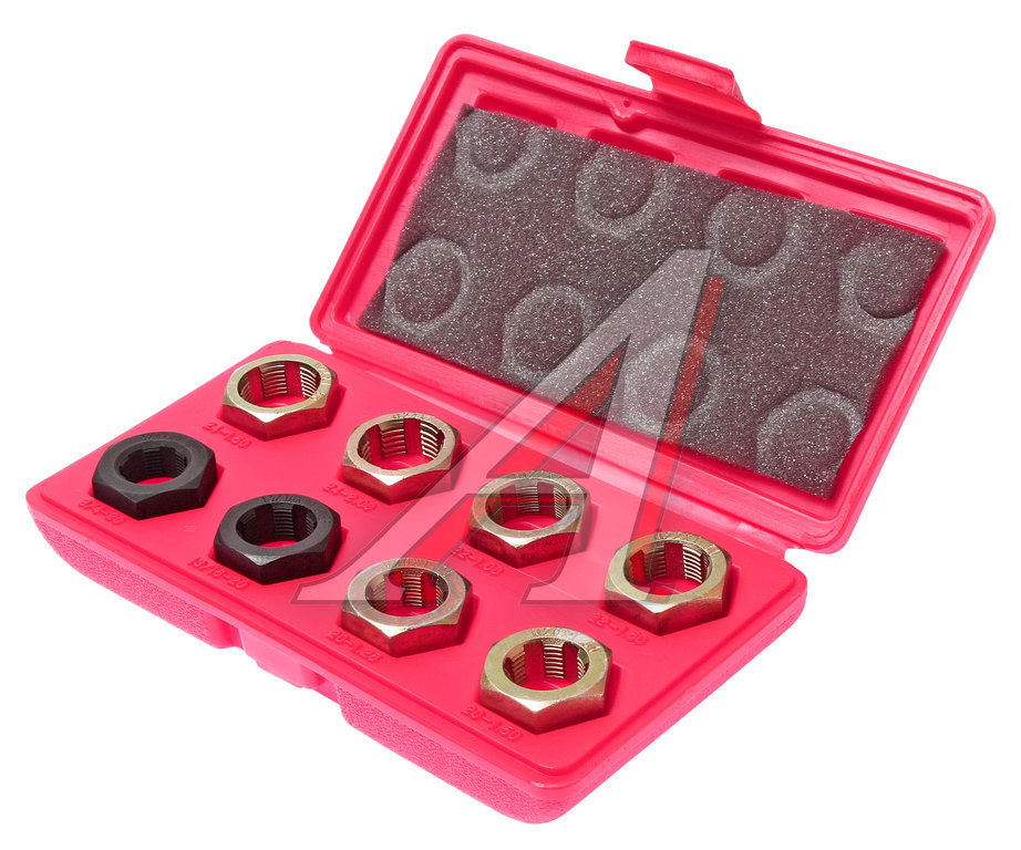 В комплект входят 8 плашек, которые применяются во время работ по восстановлению резьбы шейки оси размерами М24х1.5, М24х2.0, М22х1.0, М22х1.5, М20х1.5, М20х1.25, 13/16"х20 UNEF, 3/4"х20 UNEF. Материал плашек: S45C (сталь конструкционная). Используется с ключом или головкой 1-1/4". В комплекте 8 предметов. Упаковка: прочный пластиковый кейс. Габаритные размеры: 200/110/40 мм. (Д/Ш/В) Вес: 564 гр.