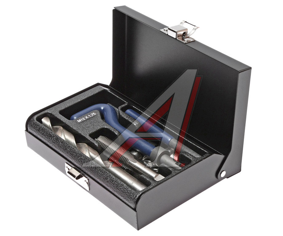 В комплекте 14 предметов. В комплект входят: сверло, метчик, установочный инструмент, инструмент для обламывания хвостовика, резьбовые вставки. Размеры: М12х1.75. Длина: 16.3 мм. Количество резьбовых вставок: 10 шт. Упаковка: прочный пластиковый кейс. Габаритные размеры: 165/110/35 мм. (Д/Ш/В) Вес: 688 гр.