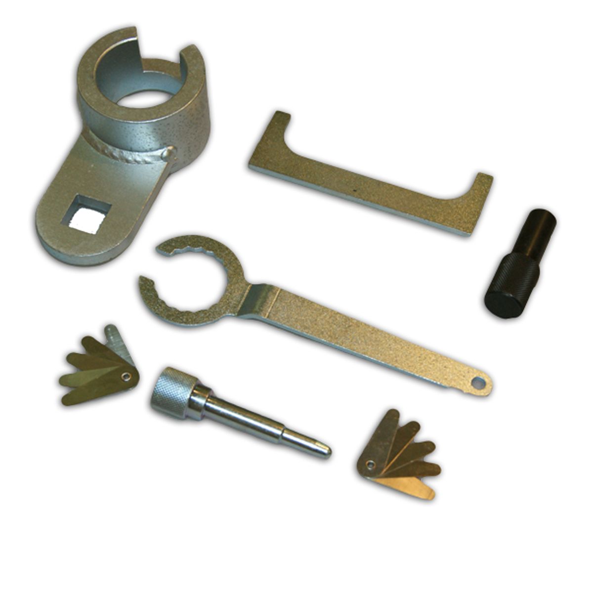 Набор приспособлений для синхронизации фаз ГРМ VAG Набор приспособлений для синхронизации двигателя используется для автомобилей Volkswagen 2.4D с кодом двигателя AAB, AJA (02/95-03) , а также WV Crafter c 2006 года выпуска. Комплектация набора для установки ГРМ VAG - T10025 – приспособление для фиксации шкива виброгасителя при откручивании центрального болта - 2065A – стопор распредвала - 2064 - фиксатор зубчатого колеса ТНВД - 3355 – накидной ключ SW32 для регулировки натяжного ролика зубчатого ремня ГРМ - T50009 – штифт для фиксации коленчатого вала двигателей, устанавливаемых на VW Crafter