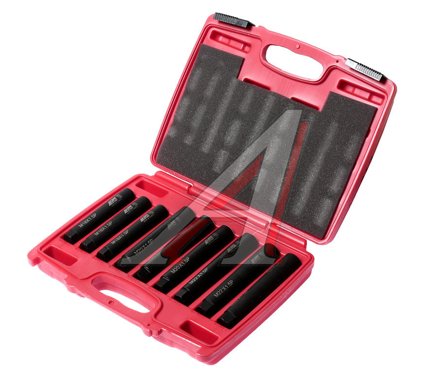 Материал: сталь S45C. Размеры: М18х1.5 (3 шт.), М20х1.5 (3 шт.), М22х1.5 (3 шт.). Специальная конструкция предотвращает повреждение резьбы во время выполнения работ по снятию колес. Использование направляющих для монтажа колес грузовых автомобилей обеспечивает правильный монтаж колес, что позволяет избежать повреждения резьбы на шпильках крепления колес. Упаковано в прочный переносной кейс. В комплект входит 3 направляющих: М18х1.5 DAF, Unilog, Ивеко (Iveko), Ман (Man), Рено (Renault), Вольво (Volvo). М20х1.5 Мерседес (Mercedes-Benz). М22х1.5 DAF, Ман (Man), Мерседес (Mercedes-Benz), Форд (Ford), Рено (Renault), Вольво (Volvo), Скания (Scania).