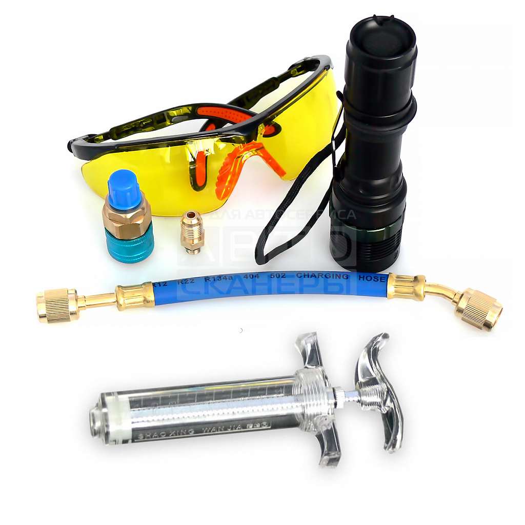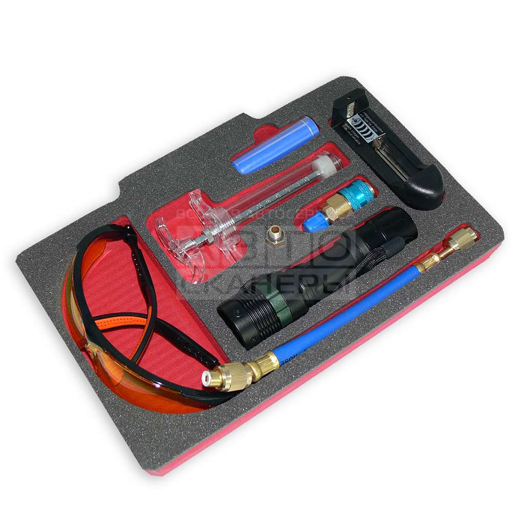 Основные инструменты в наборе – это ультрафиолетовый фонарь с аккумуляторной батареей, шприц для ввода UV красителя и желтые очки для идентификации места утечки газа с помощью ультрафиолетового красителя (опция).