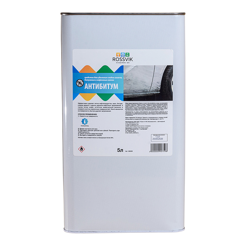 Очиститель битумных пятен Rossvik "Антибитум", 5л Эффективно удаляет пятна нефтепродуктов, смол, битума, следов резины и других дорожно-нефтяных загрязнений, а также пятен жира, остатков жевательной резинки и клеевой скотча с различных поверхностей. Легко наносится на поверхности, быстро удаляет загрязнения. - Удаляет битум, силикон, скотч, масляные подтеки - Безопасен для ЛКП - Не является ЛВЖ для ручной или бесконтактной мойки. готов к применению