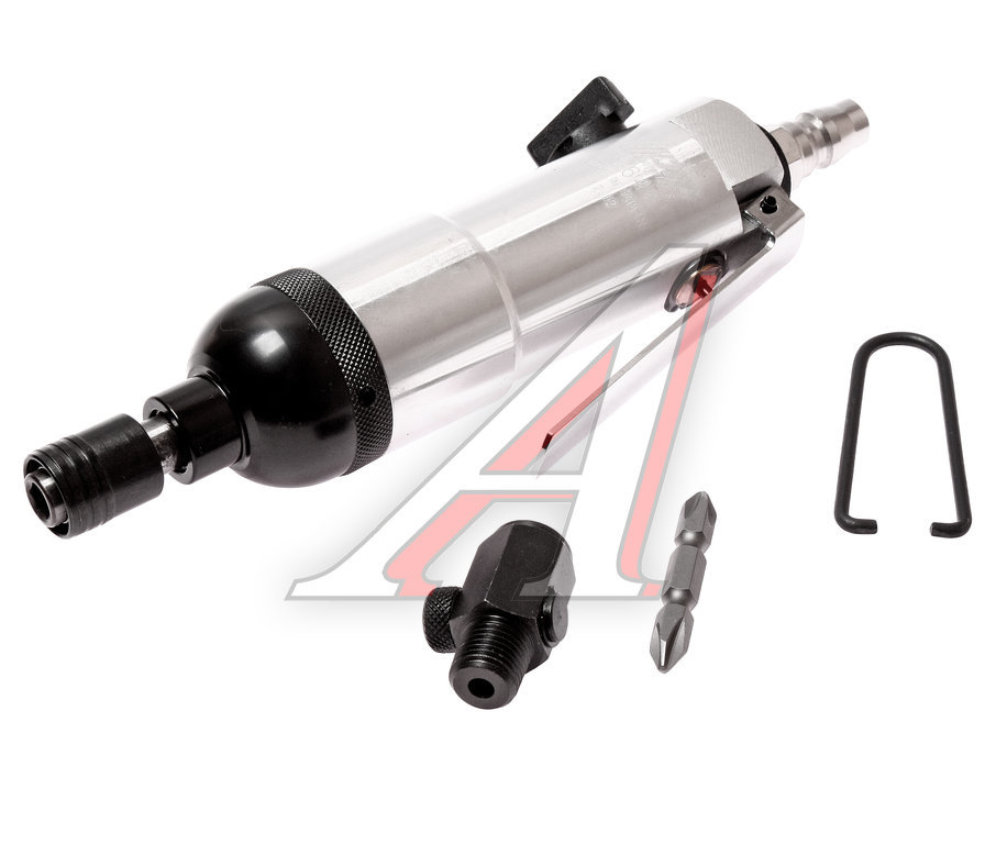 Комплектация Пневматическая отвертка – 1 шт. Бита-насадка - 1 шт. Адаптер для подключения штуцера – 1 шт. Крючок – 1 шт. Описание Предназначен для соединения листовых деталей, например при кузовных работах. Технические характеристики Патрон: 1/4" (6,35 мм). Вес нетто: 600 гр. Размер воздушного штуцера: 1/4"РТ. Скорость вращения: 9000 об/мин. Длина: 156 мм. Размер болта: 4-5 мм. Максимальный крутящий момент: 35 Н·м. Рабочее давление: 6.1 атм. Расход воздуха: 200 л/мин. Важные рекомендации Запрещено подавать высокое давление в систему – более 8 бар. Запрещено использование пневмоинструмента при температуре, близкой к 0°C. Избегайте попадания песка и грязи внутрь пневмоинструмента. Грязь и песок работают, как абразив и стирают лепестки крутящего механизма. Избегайте попадания воды внутрь корпуса. Наличие воды приводит к коррозии и разрушению крутящего механизма. Один раз в три месяца необходимо проводить профилактическую чистку пневмоинструмента. Посадочный квадрат, пружины, уплотнительные кольца, уплотнители, подшипники, лопатки ротора, металлические шарики, золотник клапана пневматического инструмента - если таковые входят в конструкцию данной модели, являются расходными материалами, и не покрываются гарантийными обязательствами производителя в случае деформации или повреждений. Обязательное условие Заявленные технические параметры пневмоинструмент показывает только при соблюдении всех требований, предъявляемых к качеству и объему подаваемого воздуха, а так же к условиям эксплуатации. Обязательным условием эксплуатации является установка в пневмолинию блока подготовки воздуха состоящего из: регулятора давления; влагоотделителя; лубрикатора для подачи смазки в рабочее пространство пневмоинструмента.