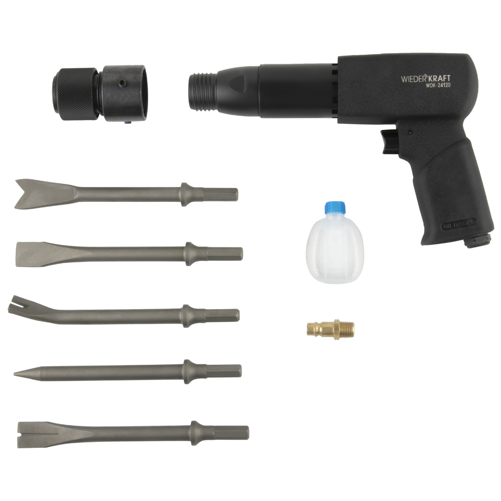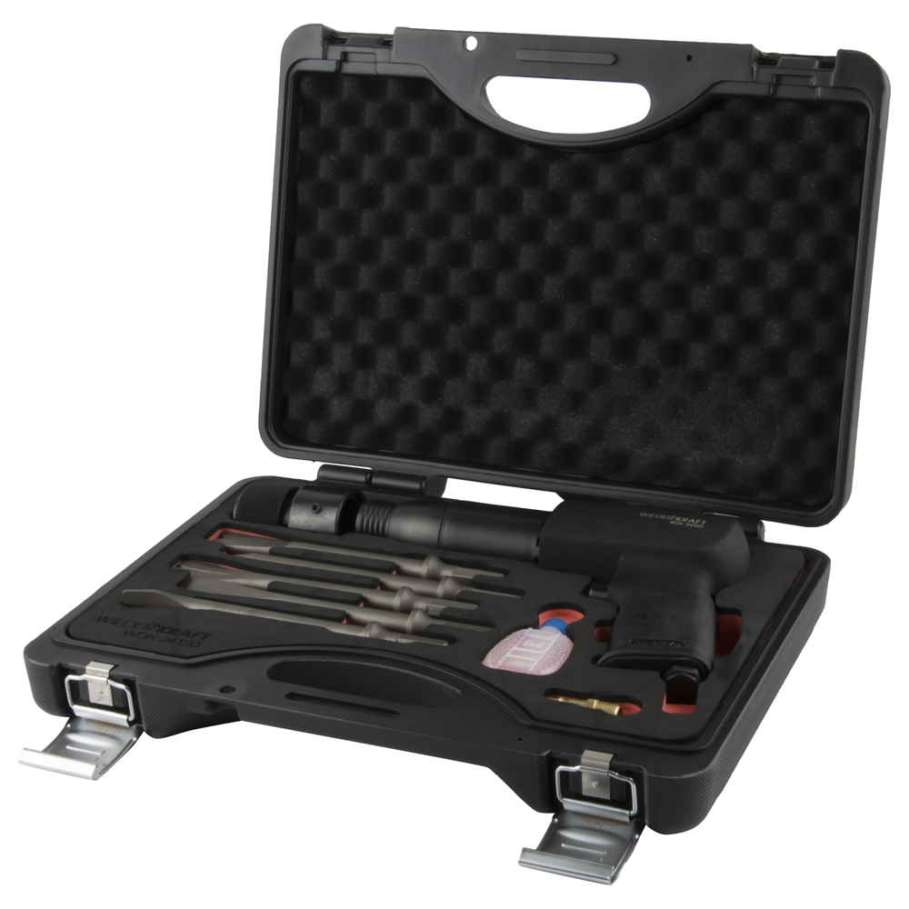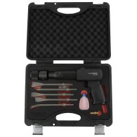 Пневматический молоток 2500 ударов в минуту в алюминиевом корпусе в комплекте с набором высокопрочных зубил из хромомолибденовой стали, съемным патроном, быстросъемным соединением 1/4″ и пневматическим маслом. Предназначен для различных ударных и режущих работ: кузовных авторемонтных, зачистки сварочных швов, отбивания заклёпок, резания листовой стали, обработки камня, бетона. Пневмозубило поставляется в пластиковом кейсе с EVA-ложементом и металлическими застежками. Класс инструмента HEAVY DUTY.