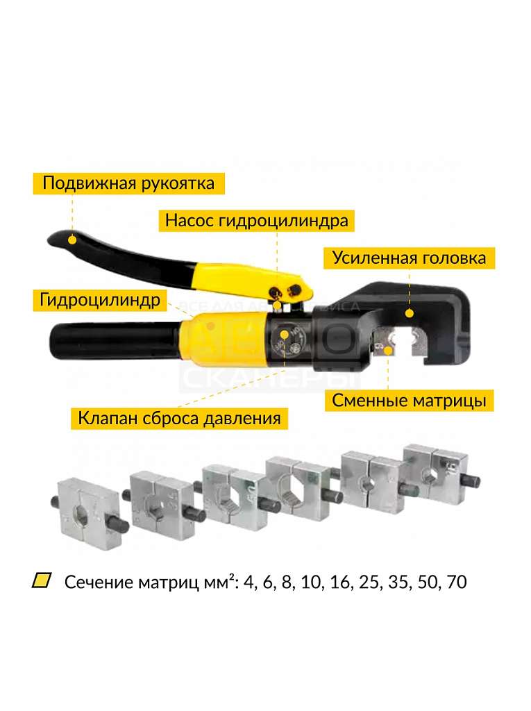 Сечения матриц входящих в комплект, мм²: 4, 6, 8, 10, 16, 25, 35, 50, 70;