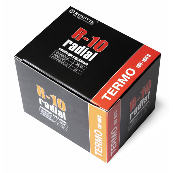 Пластыри R-10 (термо) 55х75/1 сл., 20 шт. Размер 55х75 мм 20 шт. 1 слой корда Термопластыри с текстильным кордом для ремонта радиальных шин ("горячая" вулканизация). Термопластыри ROSSVIK применяются в условиях повышенных нагрузок при эксплуатации шины. Специальный химический слой после прогрева приобретает особую прочность. Температура прогрева 140-150 °С под давлением не менее 3 Атм. Для установки термопластырей применяют специальный термоклей.