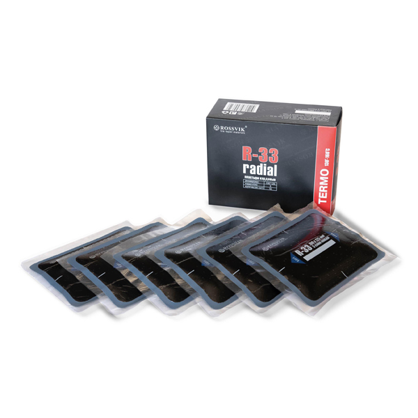 Пластыри R-33 (термо) 100х125/3 сл., 10 шт. Размер 100х125 мм 10 шт. 3 слоя корда Термопластыри с текстильным кордом для ремонта радиальных шин ("горячая" вулканизация). Термопластыри ROSSVIK применяются в условиях повышенных нагрузок при эксплуатации шины. Специальный химический слой после прогрева приобретает особую прочность. Температура прогрева 140-150 °С под давлением не менее 3 Атм. Для установки термопластырей применяют специальный термоклей.