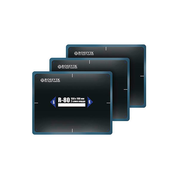 Пластыри R-80 (холодные)150х190/2 сл., 10 шт. Размер 150х190 мм 10 шт. 2 слоя корда Радиальные пластыри ROSSVIK предназначены для ремонта всех типов радиальных бескамерных и камерных шин легковых автомобилей, грузового и пассажирского транспорта, сельскохозяйственной, карьерной и землеройной техники. Они обеспечивают надежный и долговечный ремонт в любой ремонтопригодной зоне шины.