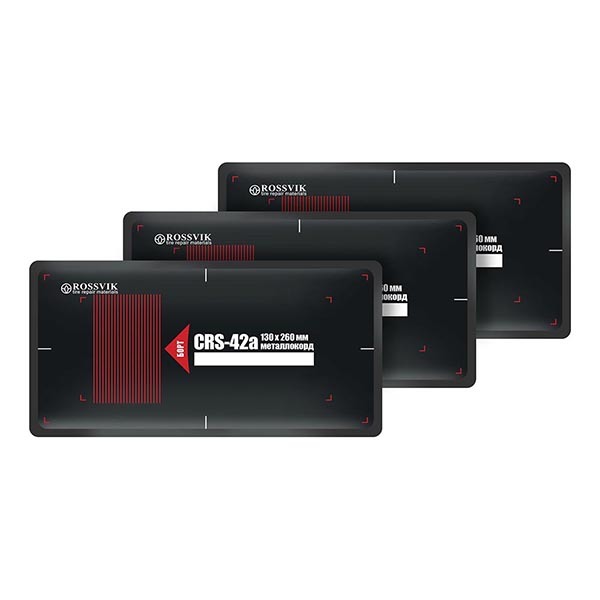 Пластыри СRS-42а (термо) 130х260, 10 шт. Комбинированные пластыри серии "Combi" для уменьшения вздутия шин ЦМК после ремонта. Пластыри металлокордовые - вид материалов для профессионального ремонта грузовых шин с цельнометаллокордовым каркасом (all steel). Слои металлического корда обеспечивают пластырям более высокую надежность и прочность. Для того чтобы уменьшить напряжение, возникающее на концах жесткого металлокордового пластыря после установки, пластыри ROSSVIK имеют дополнительный внутренний подкладочный текстильный слой, который помогает равномерно распределить напряжение по всей площади пластыря. Индекс на пластырях CRS: а - ремонт боковой и плечевой зоны.