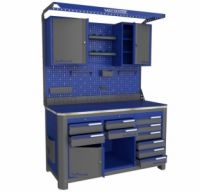 В состав рабочего места входит: Рама (металл 1,5 мм.), столешница (фанера 24 мм. + металл 6 мм.), 2 боковые перфорированные панели, модуль с дверцей и 2-я ящиками, модуль подвесной, полка-стенка, модуль с 6-ю выдвижными ящиками, блок розеток, комплект усиленных кронштейнов, 2 экрана, козырек с лампой освещения, навесной шкафчик, 2 полочки, 8 пластиковых контейнера, держатель универсальный, держатель для баллонов, держатель для ключей, держатель для отверток, держатель для бумажных полотенцев, кармашек. Сверху экрана установлена подсветка на магнитных креплениях для легкого монтажа.