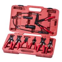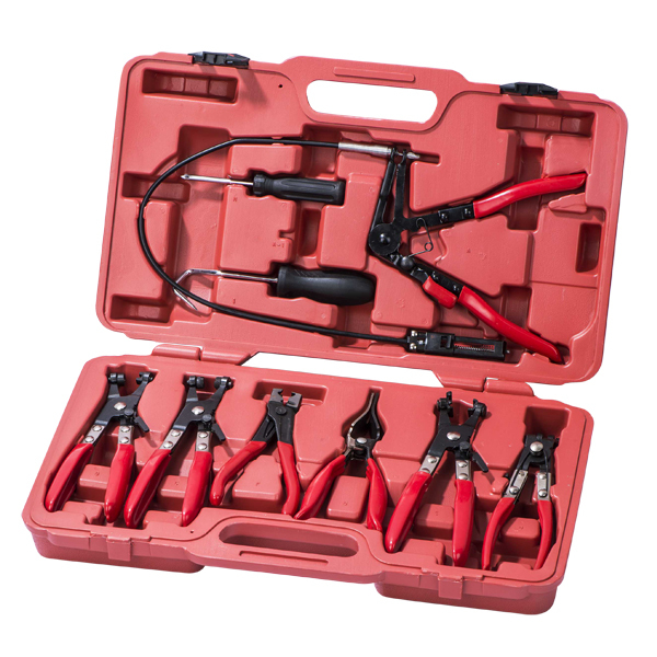 ST120 Набор щипцов для демонтажа пружинных хомутов патрубков, 9 предметов. 4 съемников хомутов, зажима с тросом, щипцов, вспомогательного демонтажного инструмента, отвертки и монтажного крюка. Набор служит для аккуратного съема хомутов патрубков и шлангов таких автомобильных систем, как охлаждение двигателя, питание и прочие.