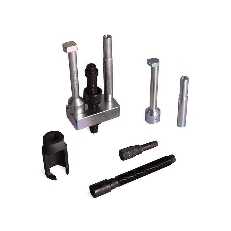 Съемник форсунок Mercedes Common Rail Съемник используется для демонтажа плотнопосаженных дизельных форсунок автомобилей Mercedes Benz и Chrysler. В набор инструмента для дизельных форсунок входит два вытяжных шпинделя для форсунок Bosch и Delphi. Перед снятием форсунки необходимо демонтировать магнитный клапан с форсунки и снять с помощью специального ключа (входит в набор) гайку клапана мультипликатора, после чего установить сам шпиндель и опорную часть съемника. Применение съемника форсунок MB Common Rail Применение по маркам автомобилей: - Mercedes: Vito, Vario, CLK, Sprinter, Viano, Classe M, GL, C, GLK, E, CLS, S, R, G - Применение Chrysler: 300 C Применение по типу двигателя: - Дизельные двигатели Mercedes: 2.1 l, 2.2 l, 3.0 V6 - Дизельные двигатели Chrysler: 3.0 V6 - Дизельные форсунки: Bosch (2.1 l, 2.2 l), Delphi (3.0) Комплектация съемника форсунок Mercedes Common Rail - Опорная часть съемника – 1 шт. - Вытяжной шпиндель – 2 шт. - Сервисная головка для магнитного клапана Bosch 29 мм – 1 шт. - Головка с осевым отверстием для гайки клапана мультипликатора Bosch 10 мм – 1 шт.