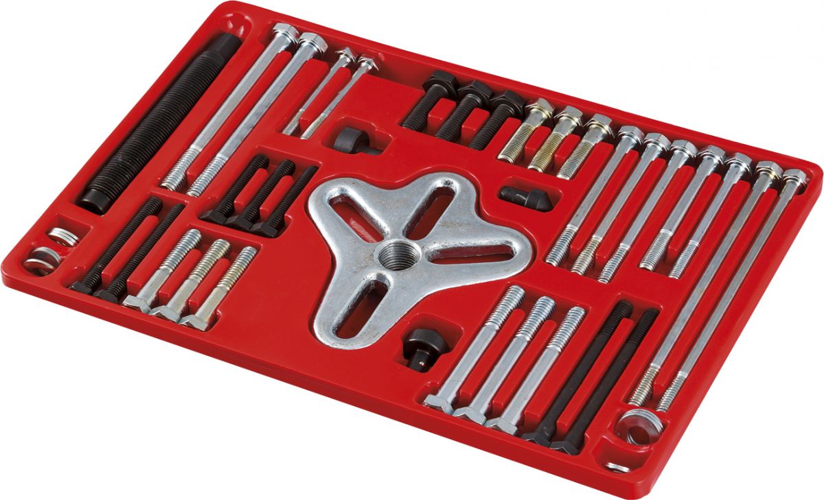 KA-1046 съемник шкивов с приспособлениями (46 пр). Используется для снятия шкивов. Принцип работы: Силовой болт вкручивается в центральное отверстье адаптера. Для удобства, на силовой болт возможно установить одну из трёх центрующих насадок. В отверстья шкива вкручиваются два или три подходящих болта через адаптер. Далее с помощью торцевой головки или гаечного ключа на 19 мм вращаете силовой болт, тем самым стягивая шкив с его оси. Особенности: Набор удобен в работе и, благодаря различным фиксирующим болтам и центрующим насадкам, является универсальным. Подходит для большинства марок и моделей легковых автомобилей. Комплект набора: Силовой болт (общая длина 130 мм) - 1 шт. Адаптер основной - 1 шт. Фиксирующие болты с различной длиной, диаметра и шагом резьбы - 30 шт. Шайбы - 11 шт. Насадка центрующая с выемкой - 1 шт. Насадка центрующая большая с конусом наружным - 1 шт. Насадка центрующая малая с конусом наружным - 1 шт. Инструкция - 1 шт. Коробка картонная с пластиковым ложементом - 1 шт. Использование набора допускается только квалифицированным персоналом с соблюдением техники безопасности!