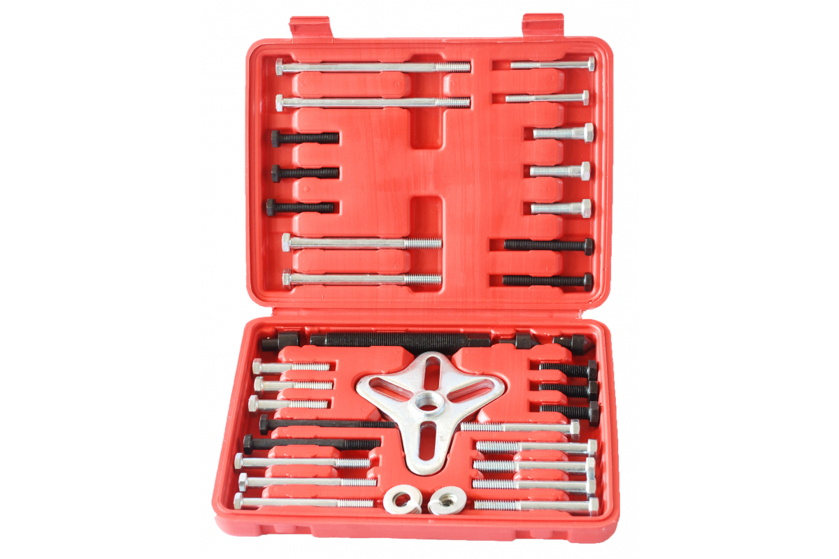 Используется для снятия шкивов различной конфигурации. Принцип работы: Силовой болт вкручивается в центральное отверстье адаптера. Для удобства, на силовой болт возможно установить одну из трёх центрующих насадок. В отверстья шкива вкручиваются два или три подходящих болта через адаптер. Далее с помощью торцевой головки или гаечного ключа на 19 мм вращаете силовой болт, тем самым стягивая шкив с его оси. Особенности: Набор удобен в работе и, благодаря различным фиксирующим болтам и центрующим насадкам, является универсальным. Подходит для большинства марок и моделей легковых автомобилей. Комплект набора: Силовой болт (общая длина 130 мм) - 1 шт. Адаптер основной - 1 шт. Фиксирующие болты с различной длиной, диаметра и шагом резьбы - 30 шт. Шайбы - 11 шт. Насадка центрующая с выемкой - 1 шт. Насадка центрующая большая с конусом наружным - 1 шт. Насадка центрующая малая с конусом наружным - 1 шт. Инструкция - 1 шт. Коробка картонная с пластиковым ложементом - 1 шт. Использование набора допускается только квалифицированным персоналом с соблюдением техники безопасности!