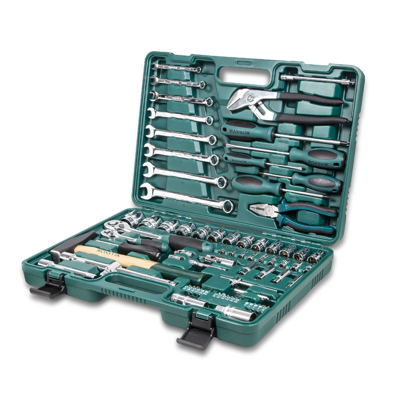 UST077 Набор универсальный ROSSVIK, 77 предметов 1/2" • Головка 1/2" 6-ти гранная: 12, 13, 14, 15, 17, 18, 19, 21, 22, 24, 27, 30, 32мм • Головка свечная 1/2": 16, 21мм • Трещотка 1/2, 36 зубов • Удлинитель 1/2", 125мм • Удлинитель 1/2", 250мм • Кардан 1/2" • Переходник M1/2" – F3/8" 1/4" • Головка 1/4" 6-ти гранная: 4, 5, 6, 7, 8, 9, 10, 11, 12мм • Головка 1/4" 6-ти гранная глубокая: 8, 10, 12, 13мм • Трещотка 1/4", 36 зубов • Вороток Т-образный 1/4", 130мм • Удлинитель 1/4", 75мм • Удлинитель гибкий 1/4", 145мм • Кардан 1/4" • Отвертка-вороток 1/4" • Держатель бит 1/4" БИТЫ 1/4" • Бита 1/4" PHILIPS: PH1, PH2, PH3 • Бита 1/4" SLOTTED: SL3, SL4, SL5, SL6 • Бита 1/4" HEX: H3, H4, H5, H6 • Бита 1/4" STAR: Т10, Т15, Т20, Т25, Т27, Т30, T40 КЛЮЧИ ГАЕЧНЫЕ • Ключ гаечный комбинированный: 8, 10, 12, 13, 14, 15, 17, 19мм • Ключ шестигранный: 1.5, 2, 3мм • Пассатижи 180мм • Клещи переставные 250мм • Молоток 500г ОТВЕРТК