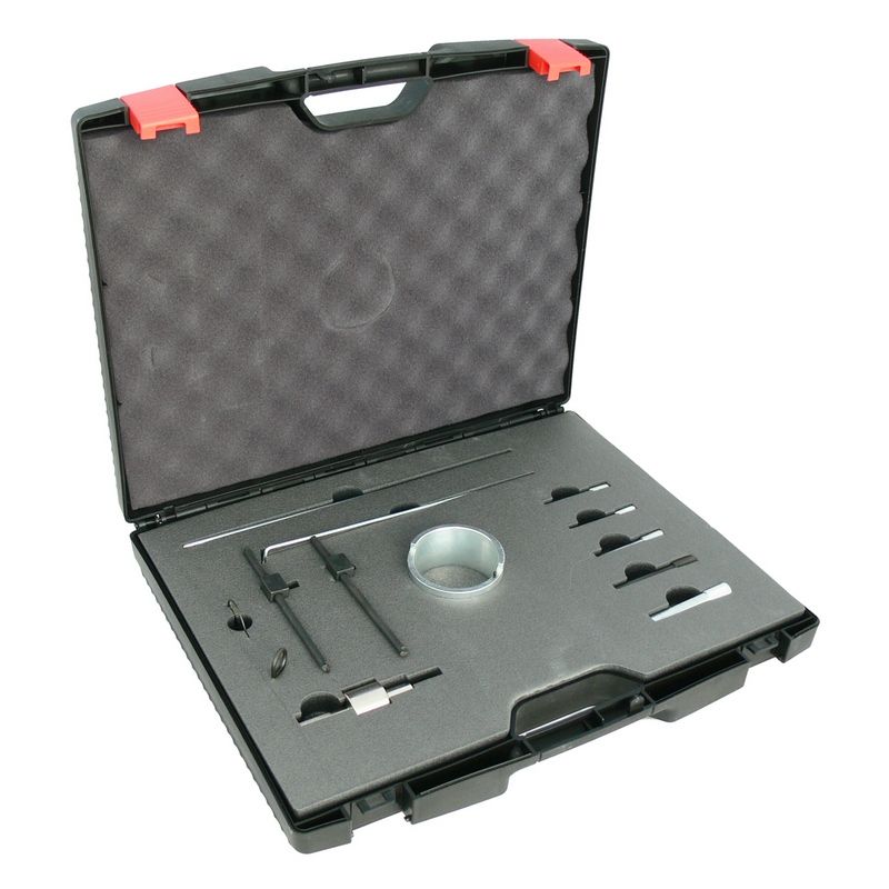 Инструмент для ГРМ PSA разработан для ремонта двигателей с бензиновым впрыском с рабочим объемом 1.8 и 2.0 литра. Назначение инструментов PSA (Peugeot / Citroen) Применяемость инструментов для PSA (Peugeot) - Модификации двигателей PSA: 6FZ (EW7J4), FRN (EW10J4 /L4 /5), RLZ (EW10D) - Citroen: Xsara 2.0 16V, C5 1.8 /2.0 /HPi, Xsara Picasso 1.8 /2.0 16V (02-05) - Peugeot: 406 1.8 16V (00-04), 807 2.0 16V (02-05) Комплектация - Приспособление для натяжения ремня ГРМ. ОЕМ 0189S2 - 1 шт - Приспособление для фиксации шкива - 1 шт - Приспособление для натяжения ремня ГРМ. OEM 0178E - 1 шт - Приспособление для натяжения ремня ГРМ. OEM 0188J2 - 1 шт - Оправка для натяжения шкива. ОЕМ 0189S1 - 1 шт - Фиксаторы. ОЕМ 0132AB - 2 шт - Фиксатор. ОЕМ 0189B - 1 шт - Фиксатор. ОЕМ 0188M - 1 шт - Фиксатор. ОЕМ 0194B - 1 шт - Фиксатор маховика. ОЕМ 0189R - 1 шт - Инструмент для фиксации натяжителя ремня. ОЕМ 7017TR - 1 шт - Фиксатор шестерни коленвала. ОЕМ 0188AH - 1 шт - Кейс - 1 шт