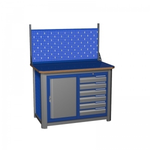 Верстак MECHANIC-М12.06Э создан с учетом требований, предъявляемых в промышленных цехах и автосервисах для слесарных работ. Каркас изделия сборочно-разборочный, что позволяет без каких-либо проблем осуществлять его транспортировку. Габариты изделия: 120x147x70 см. Максимальный вес изделий, чью нагрузку способен выдержать верстак, составляет 3 тонны. Изделие имеет два модуля. Первый модуль представлен ящиком с дверцей, а второй — шерстью выдвижными ящиками.