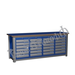 1970х2000х700 мм. со столешницей (фанера 24 мм. + 6 мм. сталь). Сборно-разборный каркас. Включает в себя: четыре модуля с 6-ю выдвижными ящиками.
