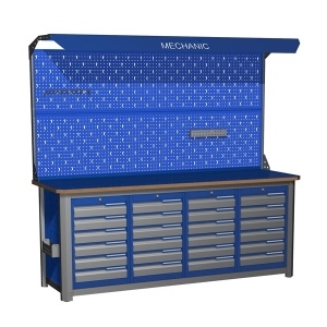 1970х2000х700 мм. со столешницей (фанера 24 мм. + 6 мм. сталь). Сборно-разборный каркас. Включает в себя: четыре модуля с 6-ю выдвижными ящиками. Сверху экрана установлена подсветка на магнитных креплениях для легкого монтажа.