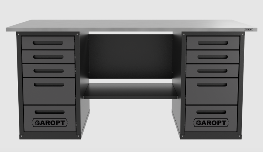 Серия "Low Cost" , Цвет: серый. Размеры тумбы 5 ящ: (ГШВ, мм) 600х465х835, вес 47.620 кг Размеры ВхШхГ: 870х1800х700 мм Столешница: МДФ 24мм + сталь 1,2 мм Материал корпуса: сталь 1,2 мм Вес: 84 кг Допустимая нагрузка на верстак: 600кг
