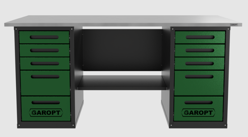 Серия "Low Cost" , Цвет: Зеленый. Размеры тумбы 5 ящ: (ГШВ, мм) 600х465х835, вес 47.620 кг Размеры ВхШхГ: 870х1800х700 мм Столешница: МДФ 24мм + сталь 1,2 мм Материал корпуса: сталь 1,2 мм Вес: 84 кг Допустимая нагрузка на верстак: 600кг