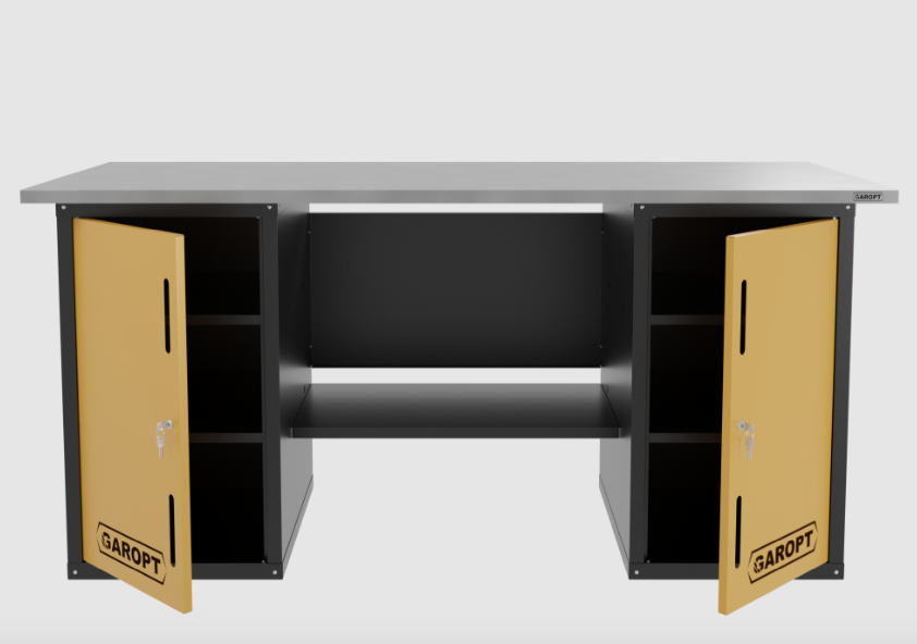 Серия "Low Cost" , Цвет: Желтый. Тумба: 2шт (дверь, две полки) Размеры тумбы: ГШВ 600х465х835, вес 26.665 кг Размеры ВхШхГ: 870х1800х700 мм Столешница: МДФ 24мм + сталь 1,2 мм Материал корпуса: сталь 1,2 мм Вес: 84 кг Допустимая нагрузка на верстак: 600кг