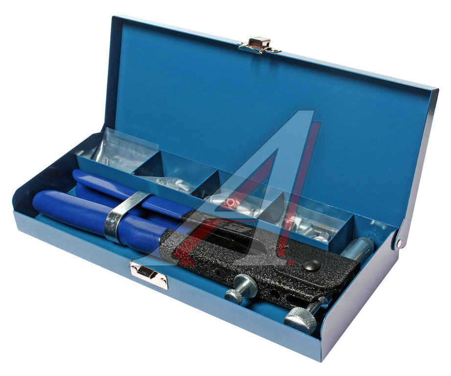 Комплектация Заклепочник - 1 шт. Насадка - 4 шт. Шпилька - 4 шт. Заклепки - по 5 шт. каждого размера. Описание Применяется для стальных и алюминиевых заклепок каждого типоразмера. Не применяется для заклепок из нержавеющей стали. Технические характеристики Длина: 270 мм. Размеры: 3, 4, 5, 6 мм. Рукояти выполнены из хром-молибденовой стали. Применение Заклепочник предназначен для работы с заклепками-гайками от М3 до М5 из стали, и от М3 до М6 из алюминия. Для работы заклепочника необходимо подобрать соответствующие заклепке шпильку и насадку. Например: для работы с заклепками-гайками М4 необходима насадка М4 и шпилька М4.