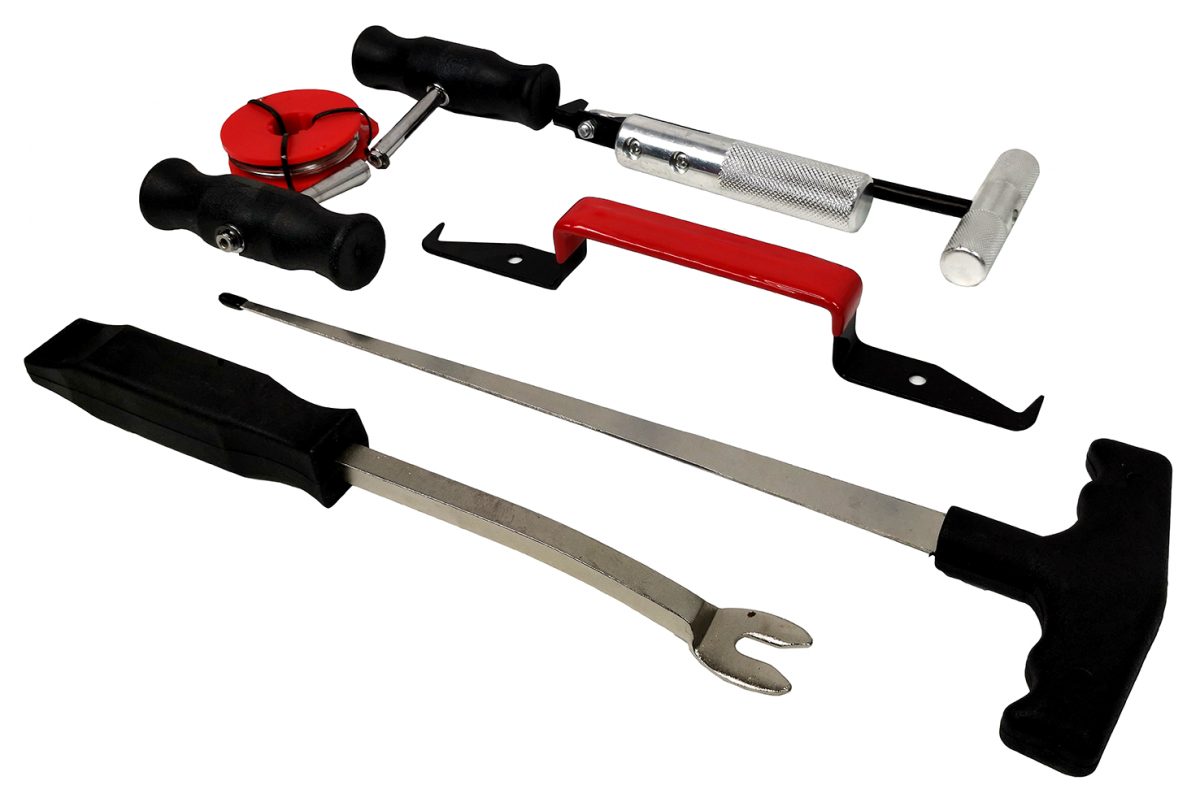 Инструмент для срезания стекол MHR04045 представляет собой полный набор инструментов для срезания стекол, в том числе специальные приспособления 6шт:нож резиновых уплотнений, струна, рукоятки 2шт, катушка с проволокой, инструмент для снятия обшивки, инструмент для снятия молдингов. Аналог TA-F1018 AE& T.