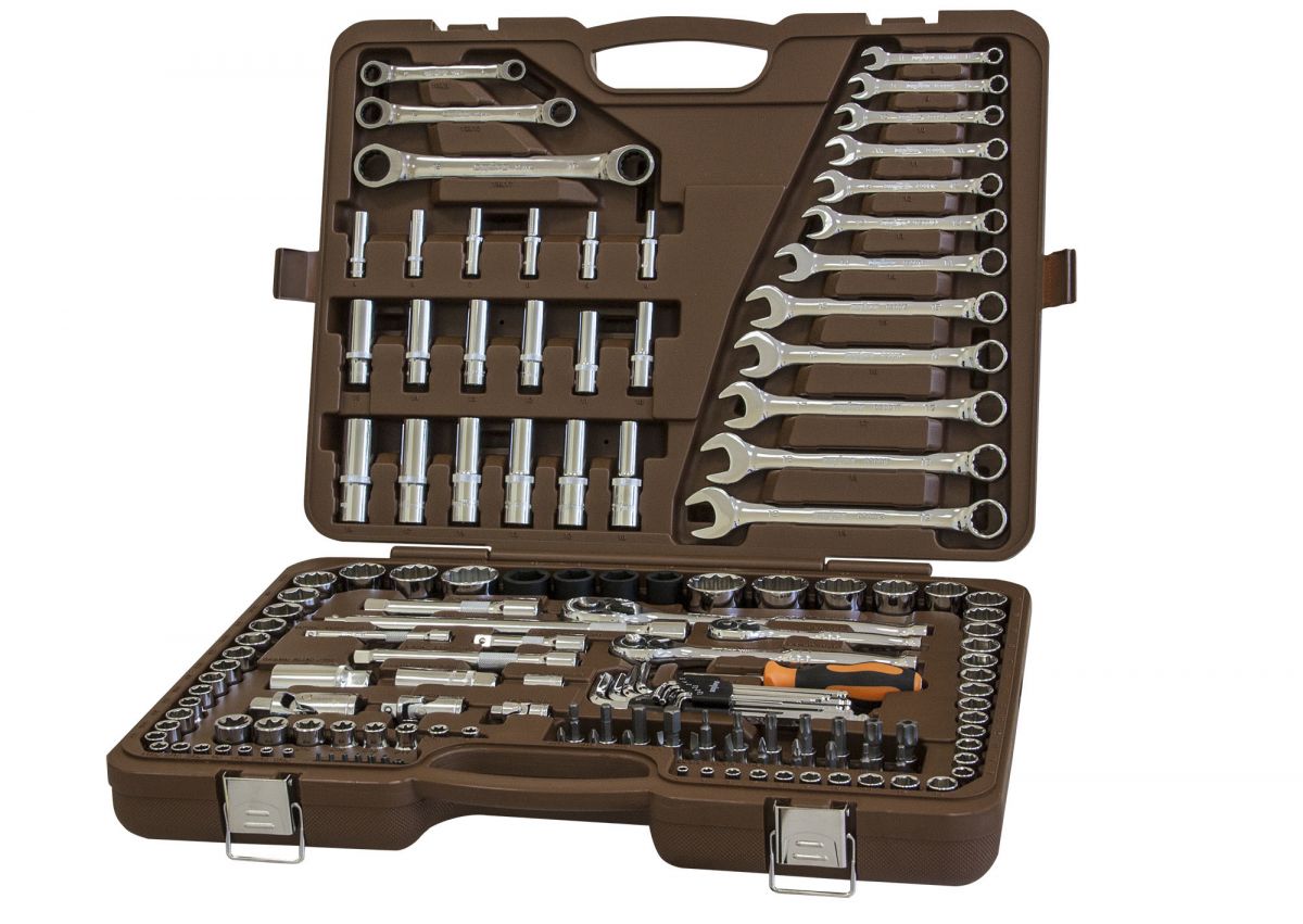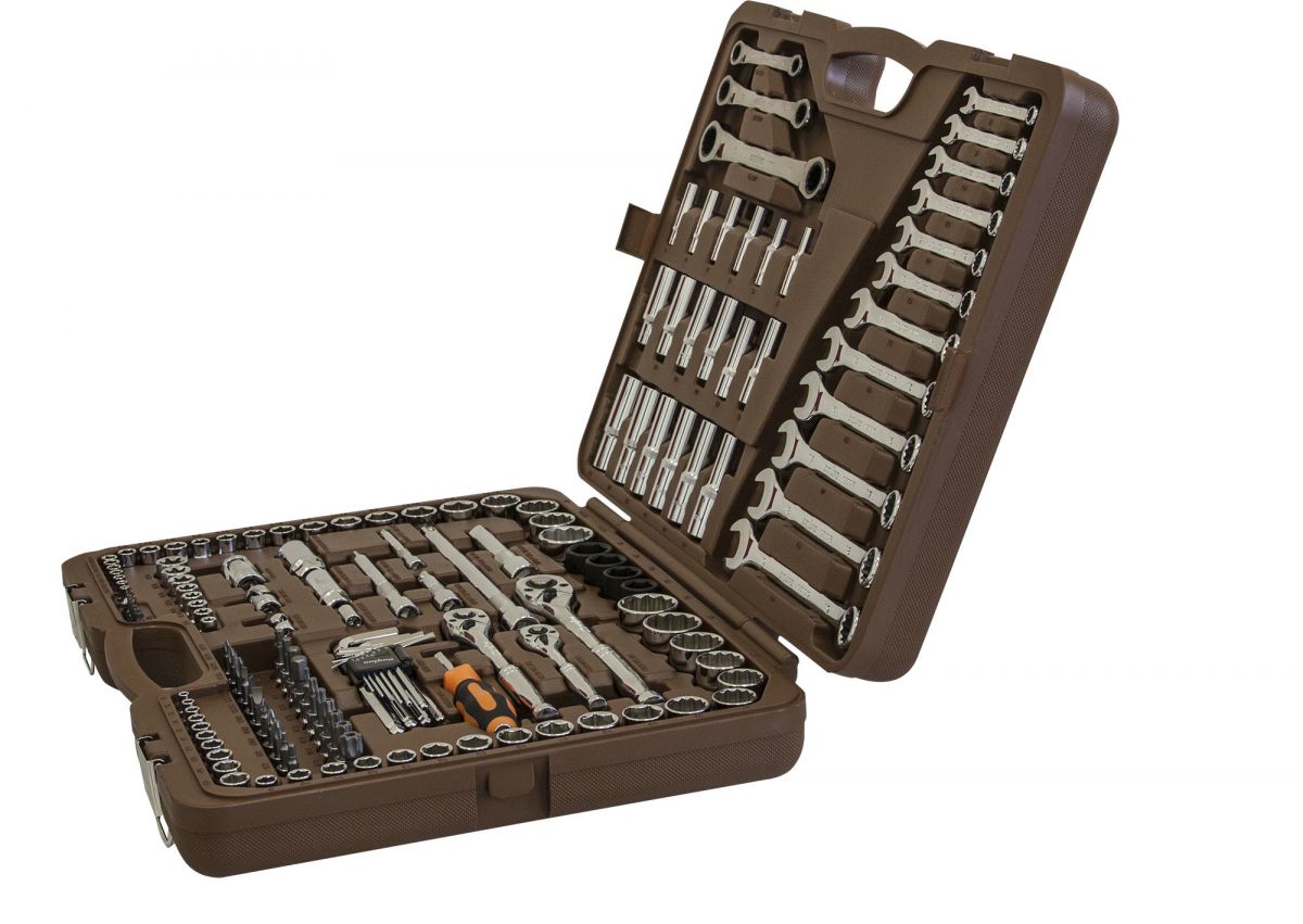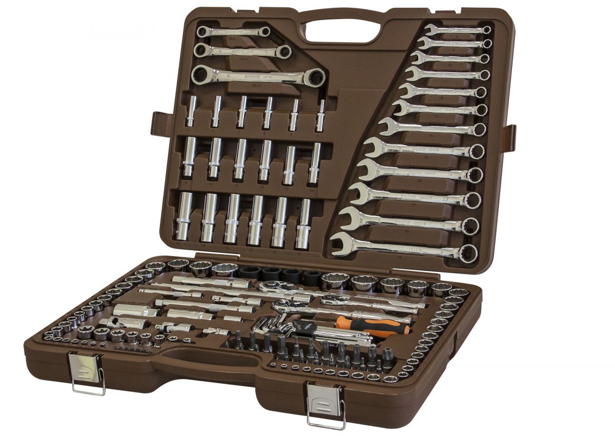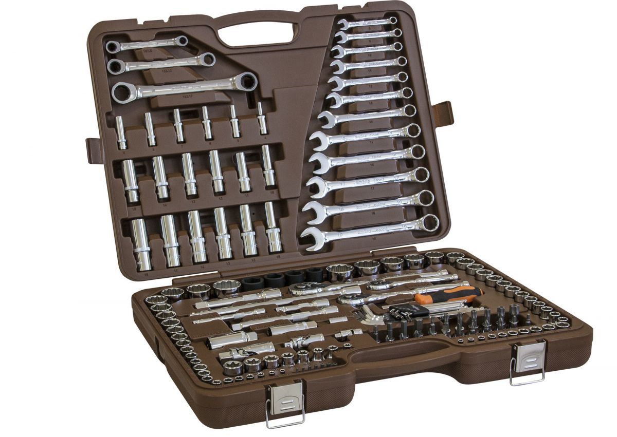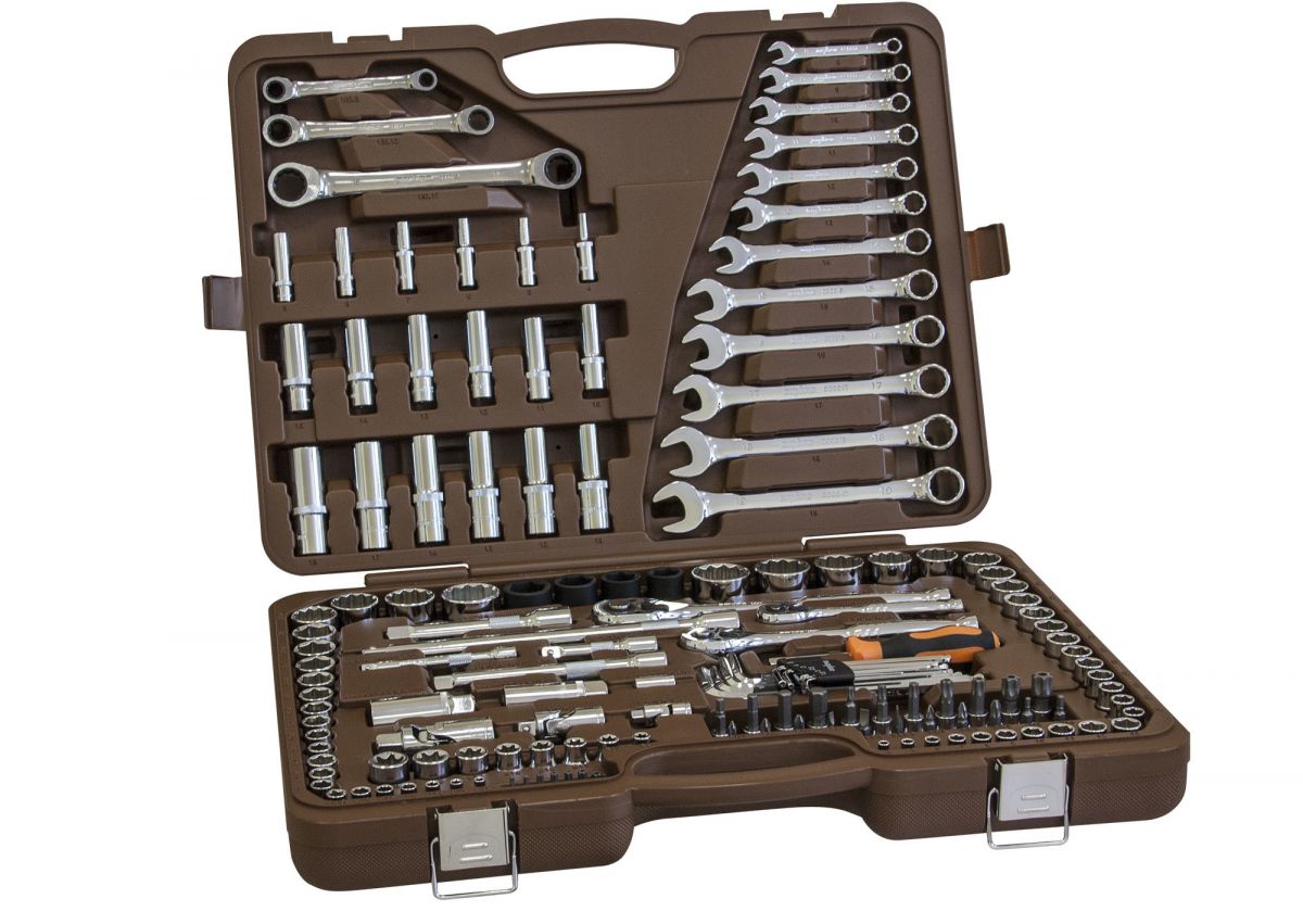 Специальный набор инструмента, комплектация которого расчитана на производство работ по техническому обслуживанию атомобильной техники в условиях ремонтных мастерских. Инструменты, входящие в состав набора, позволяют обслуживать крепежные детали метрических и дюймовых размеров. Ассортимент дополнен накидными ключами с храповыми механизмами и головками для механизированного инструмента распространенных размеров.
