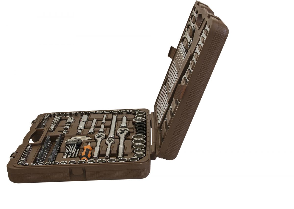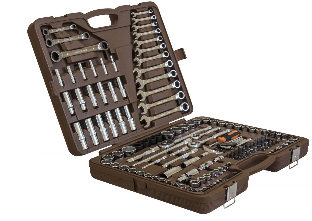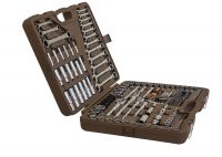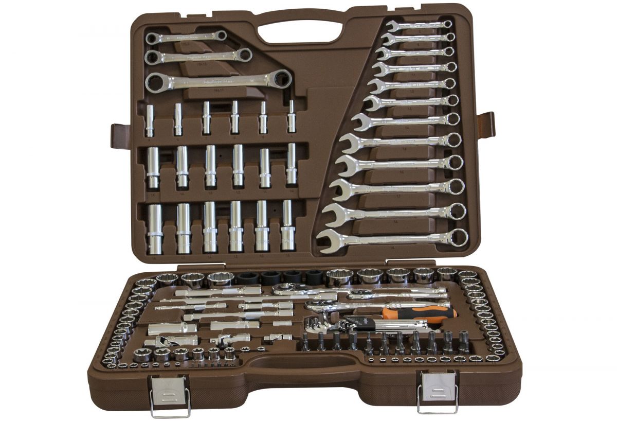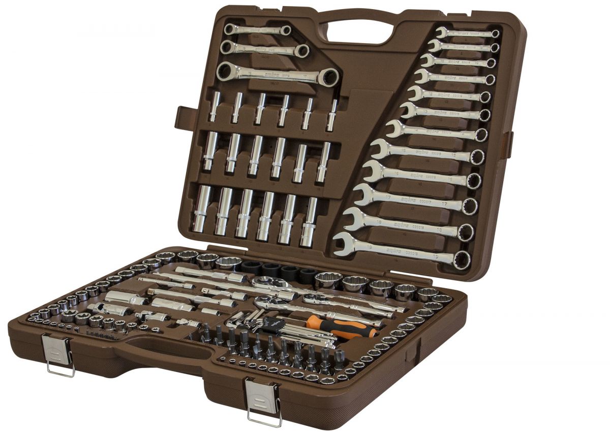 Специальный набор инструмента, комплектация которого расчитана на производство работ по техническому обслуживанию атомобильной техники в условиях ремонтных мастерских. Инструменты, входящие в состав набора, позволяют обслуживать крепежные детали метрических и дюймовых размеров. Ассортимент дополнен накидными ключами с храповыми механизмами и головками для механизированного инструмента распространенных размеров.