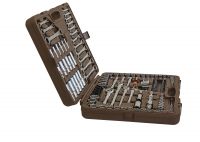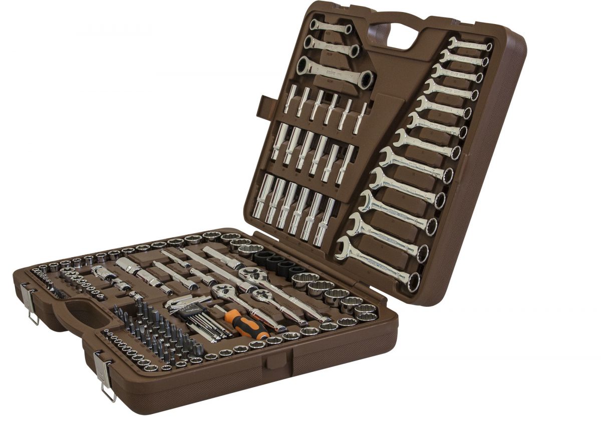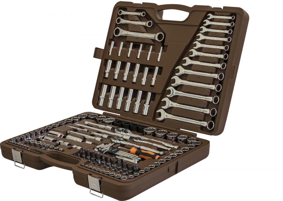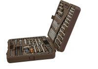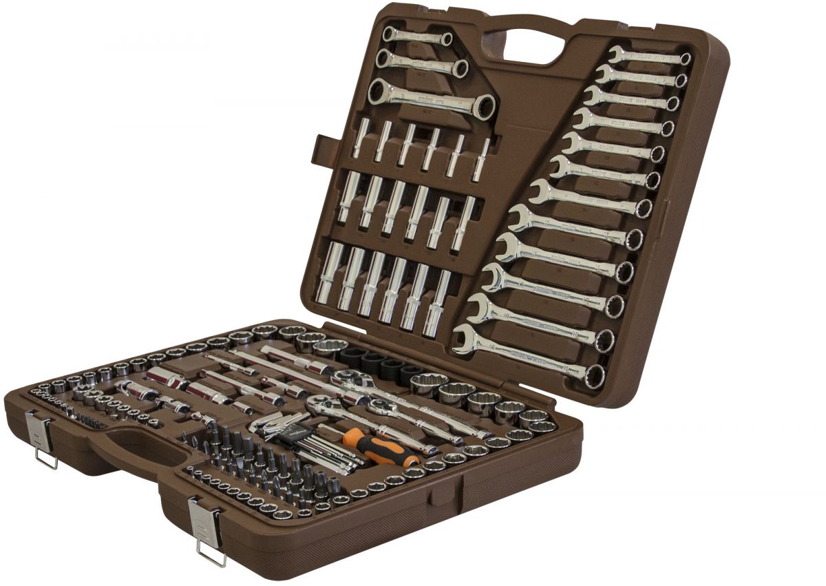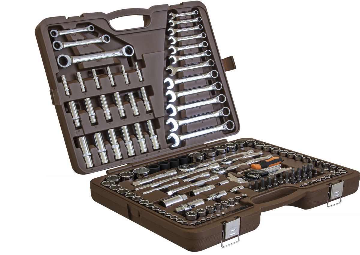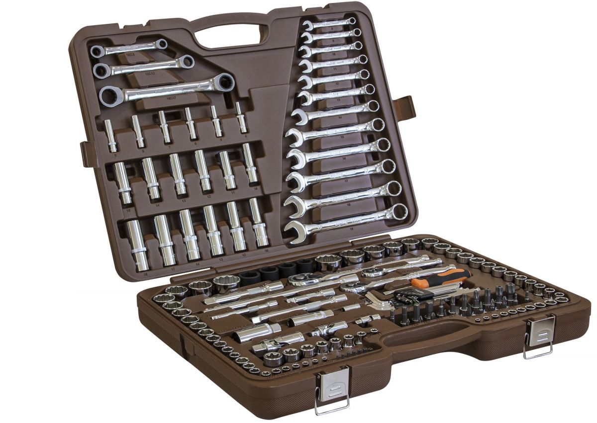 Специальный набор инструмента, комплектация которого расчитана на производство работ по техническому обслуживанию атомобильной техники в условиях ремонтных мастерских. Инструменты, входящие в состав набора, позволяют обслуживать крепежные детали метрических и дюймовых размеров. Ассортимент дополнен накидными ключами с храповыми механизмами и головками для механизированного инструмента распространенных размеров.
