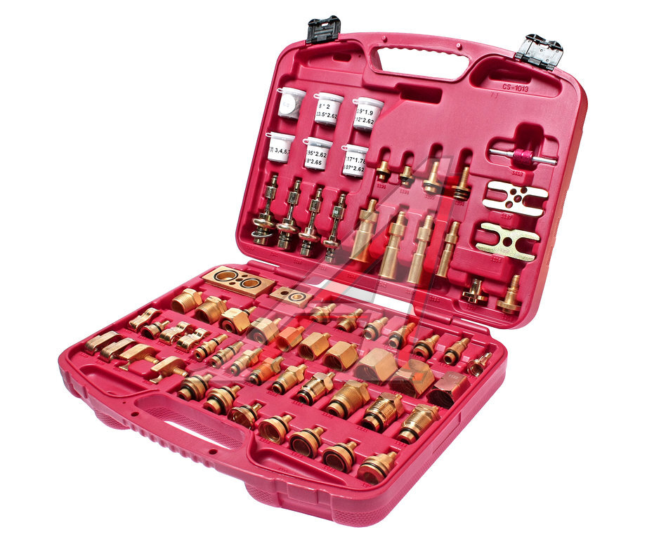 В набор входят различные адаптеры для тестирования системы кондиционирования на предмет утечек. Предназначен для проверки расширительного клапана, осушителя, компрессора, конденсатора, испарителя. Применение: автомобили европейского и американского производства. Материал адаптеров: медь. Габаритные размеры: 400/330/80 мм. (Д/Ш/В). Упаковка: прочный переносной кейс. Вес: 5140 гр.