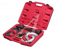 Стяжка пружинКомплектация Вал – 1 шт. Кронштейн для расширения – 1 шт. Захваты – 3 комплекта по 2 шт. Описание Комплект многофункциональных инструментов для ремонта автомобильных подвесок типа Macpherson. Предназначено для сжатия и фиксации пружины подвески с амортизационной стойкой. В комплекте входят 3 пары взаимозаменяемых захватов. Максимальная нагрузка: 10 250 N. Применение Автомобили BMW, Toyota, Ford, Mitsubishi, VW, Audi, SAAB, Nissan, Honda Accord, Subaru, Volvo, Opel, Porsche. Технические характеристики Кронштейн для расширения: вес 0,6 кг. Захваты: 1 пара х 1.45 кг. Диапазон использования: 80-115 мм. Внутренний/внешний диаметр (мм): 65/125. 1 пара х 2.2 кг. Диапазон использования: 110-150 мм. Внутренний/внешний диаметр (мм): 88/160. 1 пара х 2.3 кг. Диапазон использования: 140-195 мм. Внутренний/внешний диаметр (мм): 126/212. Вал, вес 5.17 кг, высота 453 мм. Расстояние между захватами: 305 мм. Важные рекомендации Примите все необходимые меры безопасности в момент стяжки пружины. Никогда не оставляйте без присмотра пружину в сжатом положении. После установки захватов – убедитесь, что пружина зафиксирована, то есть плотно находится во внутреннем диаметре захватов.