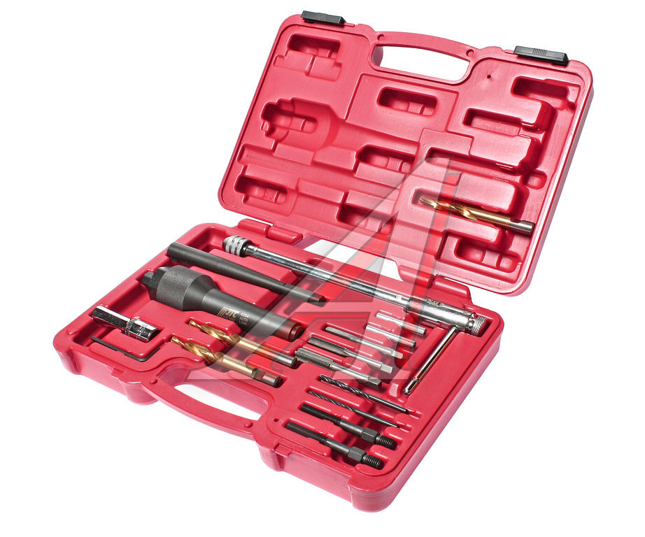 Комплектация Метчики: М8х1.0; 1/4NF28; М10х1 — 3 шт.; Буровая установка (цилиндр для удержания сверла) — 1 шт.; Сверла: Ø3.5 — 2 шт.; Адаптер для откручивания свечи (под квадратный ключ) — 1 шт.; Специальные ступенчатые сверла различного диаметра: 7х5.5, 9х5.5, 8х5.5 — 3 шт.; Т-образный вороток — 1 шт.; Устройство для извлечения свечи (используется с №9) — 1 шт.; Г-образный шестигранный ключ — 1 шт.; Шпилька для чистовой прогонки резьбы — 2 шт.; Втулка для центровки сверла — 2 шт. Описание Набор профессионального инструмента для извлечения свечей накаливания и восстановления резьбы в их колодцах, а также для высверливания шпилек, болтов, свечей зажигания. Адаптер под квадратный ключ применяется для снятия головки свечи накаливания. Для надежной фиксации адаптера на головке свечи используется молоточек. Набор также применяется для высверливания и извлечения болтов, шпилек, свечей зажигания и т.д. В набор входят сверла различного диаметра, втулки, конусы, а также метчики для восстановления резьбы. Общее количество предметов: 17. Порядок работы Удалить из свечи оставшийся центральный стержень; Вставить в колодец свечи направляющую трубку (конус-центр) — для этого из него необходимо извлечь резьбовой стержень и гайку; Собрать буровую установку (вставить в нее сверло соответствующего диаметра, саму установку вставить в дрель); Произвести сверление — во время этой операции, благодаря ступенчатому устройству сверла, будет высверлена резьбовая часть свечи, а внутренний канал свечи будет высверлен до необходимого для дальнейшей работы диаметра; С помощью Т-образного воротка и метчиков произвести нарезку резьбы внутри свечи; Через направляющую трубку вкрутить в свечу нарезной стержень, сверху закрутить гайку; Медленным закручиванием гайки извлечь свечу (это устройство выступает в роли домкрата — при закручивании гайки стержень будет подниматься, и тащить за собой свечу); Восстановить резьбу для вворачивания свечи. Важные рекомендации Перед началом работ со свечой извлеките форсунку соответствующего цилиндра. Через адаптер подключите компрессор и создайте давление в цилиндре, чтобы стружка и грязь не попали в него во время работы. При нарезании резьбы метчиком необходимо обеспечить подачу масла — так резьба получится более качественной и ровной. При нарезании резьбы необходимо соблюдать строгую центровку.